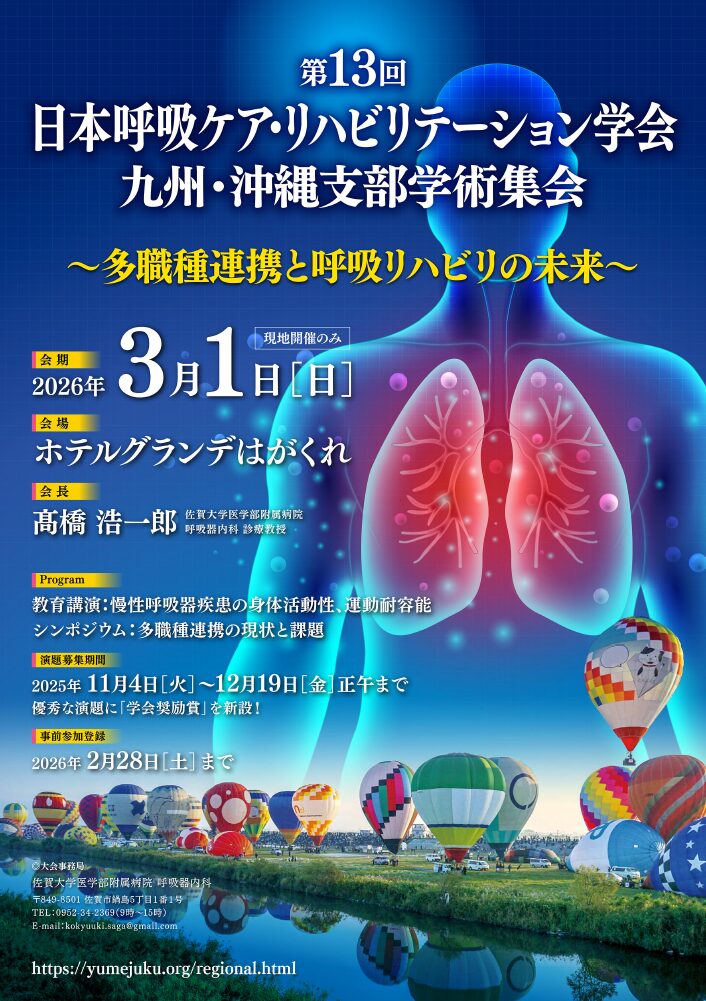 第13回日本呼吸ケア・リハビリテーション学会 九州・沖縄支部学術集会を開催いたします。本学会は、呼吸ケア・リハビリテーションに関わる多職種からなる学会です。本学術集会では「多職種連携と呼吸リハビリの未来」をテーマに掲げました。呼吸リハビリテーションは、慢性呼吸不全や高齢化に伴う呼吸機能低下への対応において、患者のQOLを高めるために不可欠です。本学会が、様々な職種の皆様方にとって学びと交流の場になり、地域に根ざした包括的呼吸ケアの発展に寄与することを願っております。